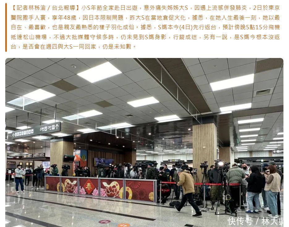 目前大S的遗体已经火化了,之前台媒曝徐妈妈带着两个外孙先一步回台提前准备葬礼事宜,但飞机落地后没看到S妈,行踪成谜。或许是等到6日,她和具俊晔、小S一起带着骨灰回来。