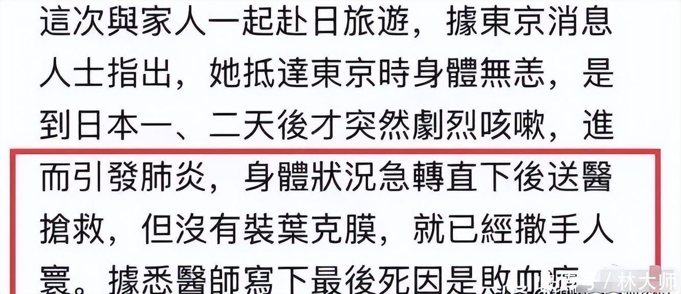 没想到几小时后,姐姐就情况严重,送到医院后就再也没醒来。另外小S通过经纪人告知外界的消息是流感引发肺炎,但台媒报道,真正的死因是肺炎严重引发了败血症,所以最终导致大S离世的原因是败血症。